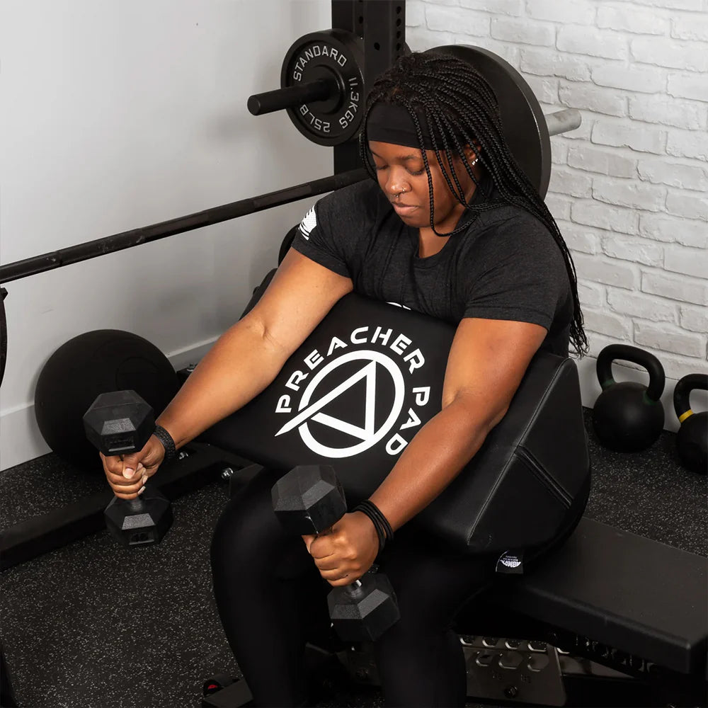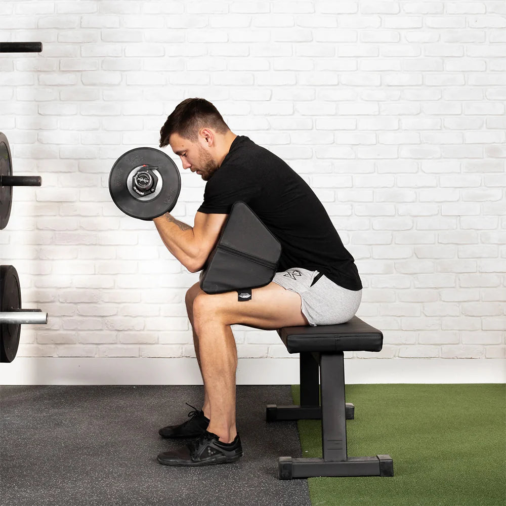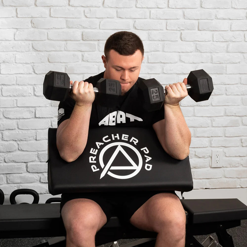 The idea of the Preacher Pad originated from Adam Hensley of Garage Gym Lab, which was brought to fruition through our collaboration with AbMat. We optimized the design to provide a cost-effective and space-saving option to buying a preacher curl machine. By placing the pad in your lap while seated, you can achieve the perfect angle for preacher curls while relying on the natural support of your body's contours for cushioning.